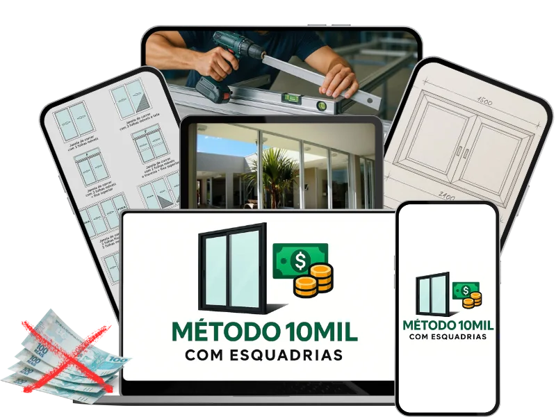 Com o Método 10Mil com Esquadrias, você aprende o passo a passo para produzir portas e janelas que custam R$300 para fabricar e vendem por até R$1.200 cada, mesmo sem experiência.